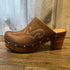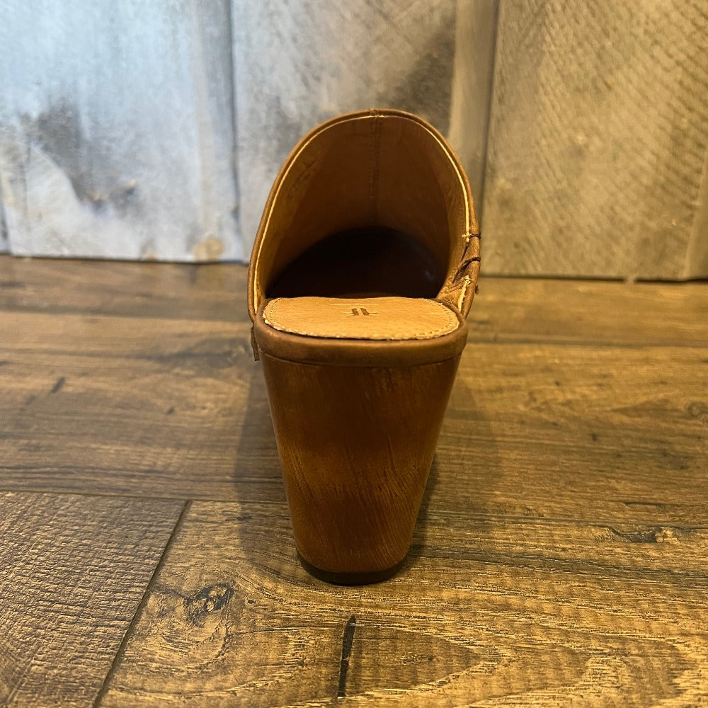 This modern clog features hand burnished wood bottoms with antique brass tack detailing. The pattern is available in both soft suede and leather uppers with stitching detailing A Fall key fashion pattern.