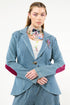 Stripe denim button-up lined blazer with crystal pin attached to the front lapel, 2 front flap pockets, 2 velvet elbow patches * Denim stripe