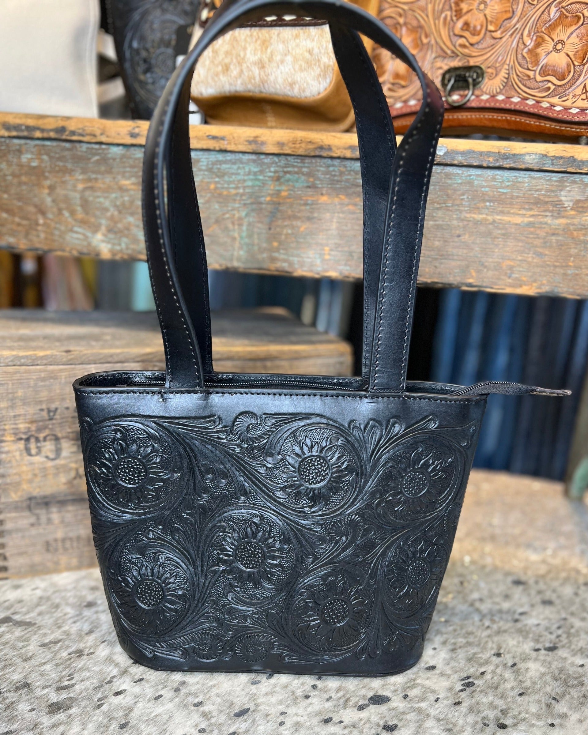 Introducing our Black Tooled Bag, crafted from hand-picked premium quality, genuine leather. Detailed with beautifully hand-tooled sunflowers, this bag is truly one-of-a-kind. With a spacious interior including a zip pocket and open pocket, and a secure zip closure, this bag is perfect for keeping all your essentials organized. Complete with a double shoulder strap and crafted by the finest leather craftsmen at American Darling, this bag is the epitome of Western style and quality. Each bag is unique, making it a statement piece for any outfit.