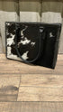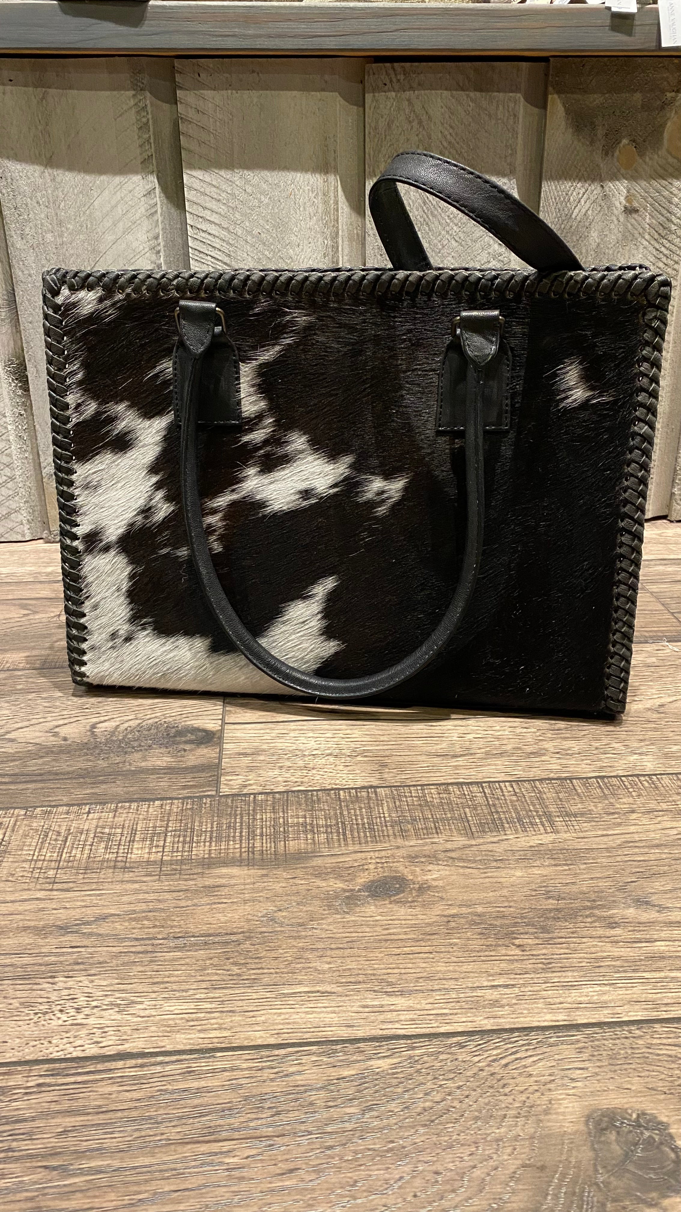 This tote bag is expertly crafted using black hide, with a leather back that boasts a hidden pocket for convenient storage. Whip-stitched details adorn all sides, adding a touch of elegance and sophistication. The interior is lined with soft fabric and features multiple pockets, including a zippered closure pocket. The cross body strap is detachable, giving you versatile styling options. Measuring 16" wide, 12" tall, and 4 1/2" deep, this bag exudes luxury and exclusivity.