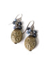 Opaque Czech glass beads with filigree etching are dangled below a cluster of iolite and blue czech glass, accented by antique brass findings.