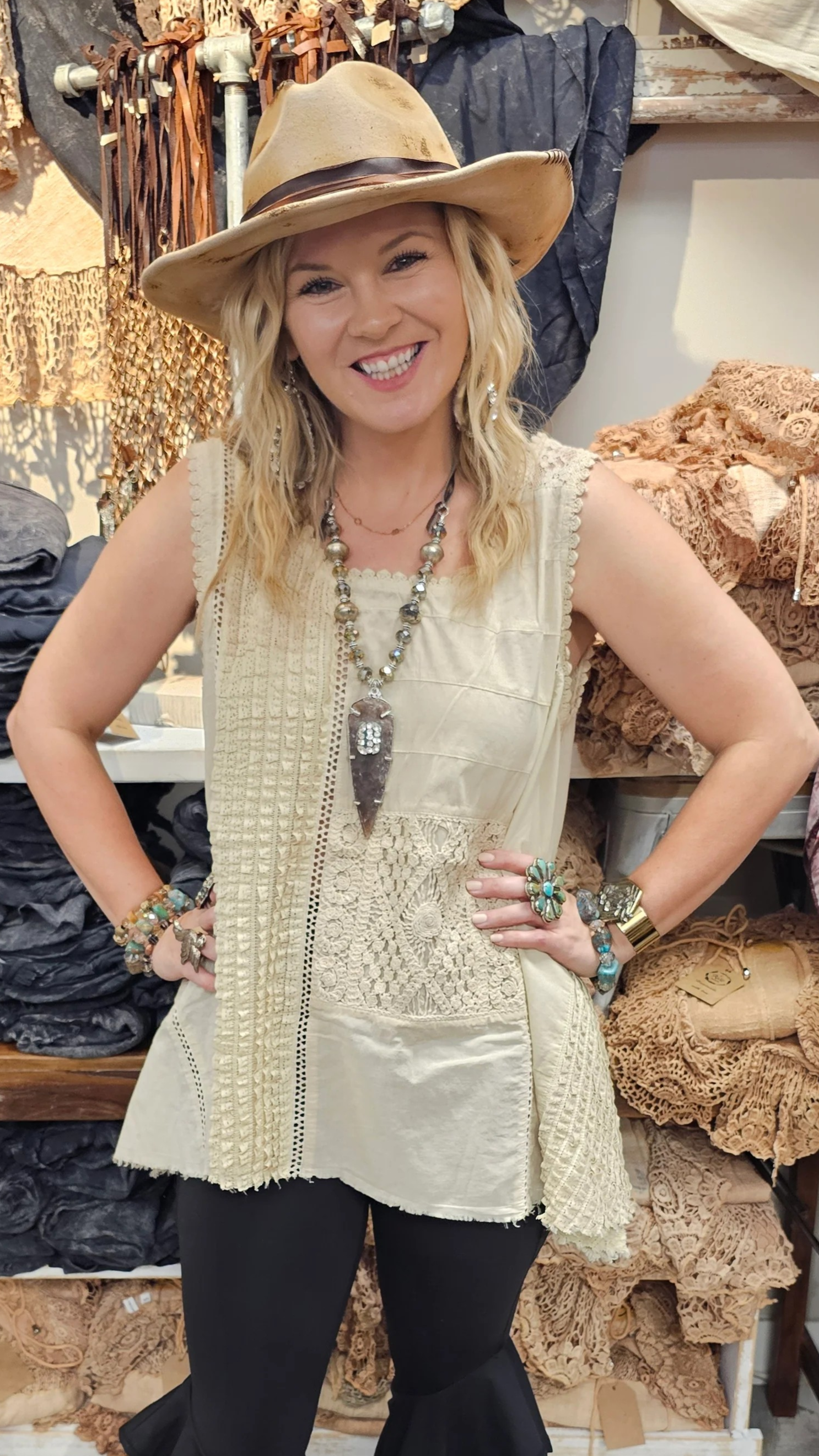 Indulge in effortless elegance with our Vintage Tea Lace Cami. Perfect for any spring or summer outfit, this versatile piece features intricate lace detailing that adds a touch of sophistication. Wear it as a shirt or a cami, and elevate your style to new heights.
