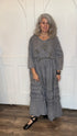 This elegant gray midi dress features a flattering round neck and long sleeves, perfect for versatile wear. Delicately embroidered with an owl on the bodice and intricate floral patterns along the flared skirt, it brings a subtle touch of nature-inspired charm. Soft muted tones enhance its graceful appeal, while the ruffled details add movement and femininity. Ideal for any occasion, this dress combines comfort with refined style effortlessly.