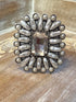 Elevate your style with this Large Pearl and Crystal Cuff, featuring a striking medallion design. Pearls radiate elegantly from a dazzling princess-cut clear crystal centerpiece, all set on a substantial silver cuff that commands attention. Perfect for adding a touch of timeless sophistication to any outfit.