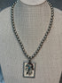 This desert pearl necklace features a detailed soldered design of a skull wearing a Native American headdress, combining bold symbolism with unique craftsmanship.