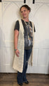 This long crochet vest, extending below the knee, is designed with two front ties for a customizable and flattering fit.