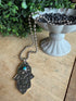 This silver necklace features an intricately embossed hamsa pendant adorned with a vibrant turquoise stone, suspended on a sleek silver ball chain. Its unique design combines elegance with meaningful symbolism, making it a captivating accessory for any occasion.