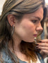 This silver hoop earring features a post back and is accented with a subtle teal tint on the outer edge, adding a unique touch to its classic peace design.
