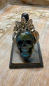 This exquisite piece features a carved labradorite skull adorned with a silver floral headdress ring. Glimmering with iridescent hues, this skull exudes a sense of mystery and elegance. Perfect for the artistic and discerning individual, add a touch of luxury to any outfit with this unique accessory.