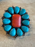 Infuse a touch of luxury and sophistication with our Large Turquoise and Red Stone Ring. This statement piece features a stunning rectangular red stone encircled by beautiful turquoise stones, all mounted on a Size 9 ring. Measuring approximately 2 3/4" wide and 3" tall, it's the perfect accessory for adding a pop of color and elegance to any outfit.