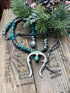The Navajo Naja is sterling silver with a turquoise focal signed by the artist. The necklace is a mixture of raw turquoise beads and African Mali beads on a wire strand. The closure is soft suede which loops around the rounded Buffalo Nickel. This is a one of a kind.