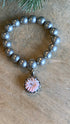 This silver bracelet features a beautiful pink conch shell flower drop on a stretchable silver bead band.