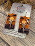 These charming earrings feature a delightful pumpkin head scarecrow set against a scenic acrylic rectangular backdrop, hanging gracefully from fish hook wires. Perfect for adding a playful touch without chasing anyone away.