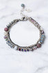 A collage of cool tones including crystal, blue lace agate, and pearl blend with accentuating antique brass and antique silver plated brass chain in a multi strand design.