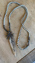 this is truly a unique piece of jewelry - The Shaman Stick Necklace is artfully made with a combination of tied bone and pyrite beads and a shaman stick and evil eye pendant. The necklace measures 36 inches, with a hook and loop closure. The acutal shaman stick measures 4.5" long and carved out of antler.