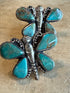 Indulge in the allure of our adjustable ring featuring a turquoise butterfly with intricate stone wings, spanning approximately 2 3/4". Each ring is one-of-a-kind, showcasing the distinctive and mesmerizing tones of the turquoise stones.
