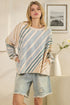 Experience effortless style with this Taupe Raw Edge Stripe Top. Featuring a relaxed fit and cozy long sleeves, it offers comfort and ease for everyday wear. The round neckline and ribbed cuffs add subtle structure, while the diagonal raw edge stripes bring a modern, textured look. Practical side seam pockets and a loose hemline with raw edge detailing complete this versatile piece, perfect for casual outings or layering on cooler days. Elevate your wardrobe with this unique, laid-back staple.