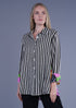 Introducing our Black and White Stripe Print Back Shirt. This collared, button-up shirt features a matching print on the cuff and back panel, adding a touch of elegance to any outfit. With long sleeves and side seam pockets, it combines style and functionality. Elevate your wardrobe with this sophisticated piece.