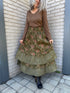 Experience effortless style with the Kais Layered Skirt in Havana. This midi-length skirt combines solid and floral tiered layers in a charming mixed fabric design, creating a look that's both versatile and eye-catching. The wide ruched elastic waistband ensures a comfortable, flattering fit for most sizes, making it an ideal choice for any wardrobe. Perfect for dressing up or down, this pull-on skirt blends comfort with feminine flair.