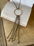 This is a hammered gold vermeil ring with an oxidized Pewter chain tassel & oxidized Sterling Silver drops on Gunmetal chain. The necklace is approximately 29 inches long and the ring & tassel add another 10 inches.