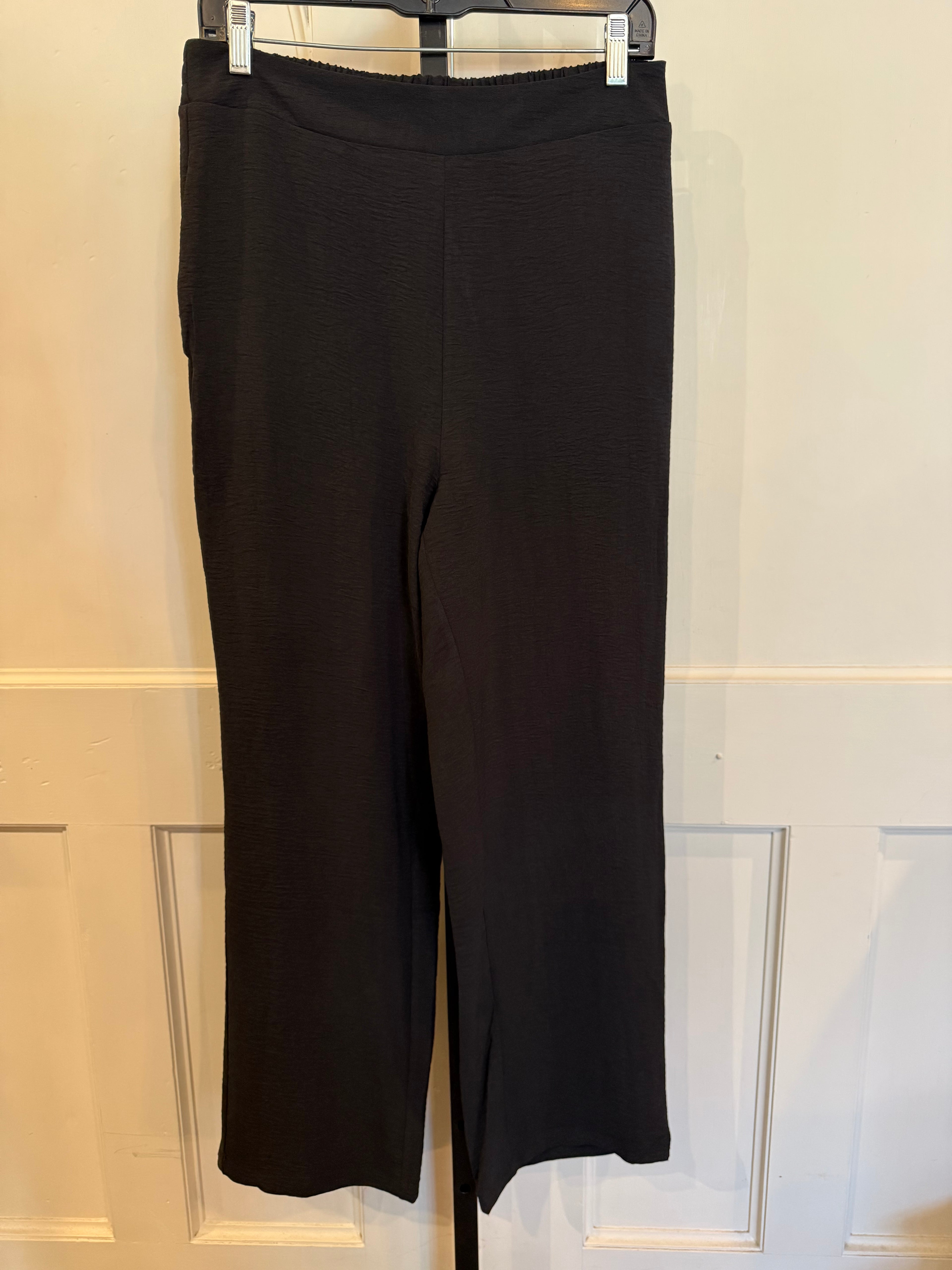 These Black Airflow Pants feature a pull-on design crafted from a crêpe-like fabric for effortless wear. They offer a comfortable elastic waistband at the back with a smooth flat front, complemented by side seam pockets. The full-length slim fit contours the hips for a sleek, flattering silhouette.