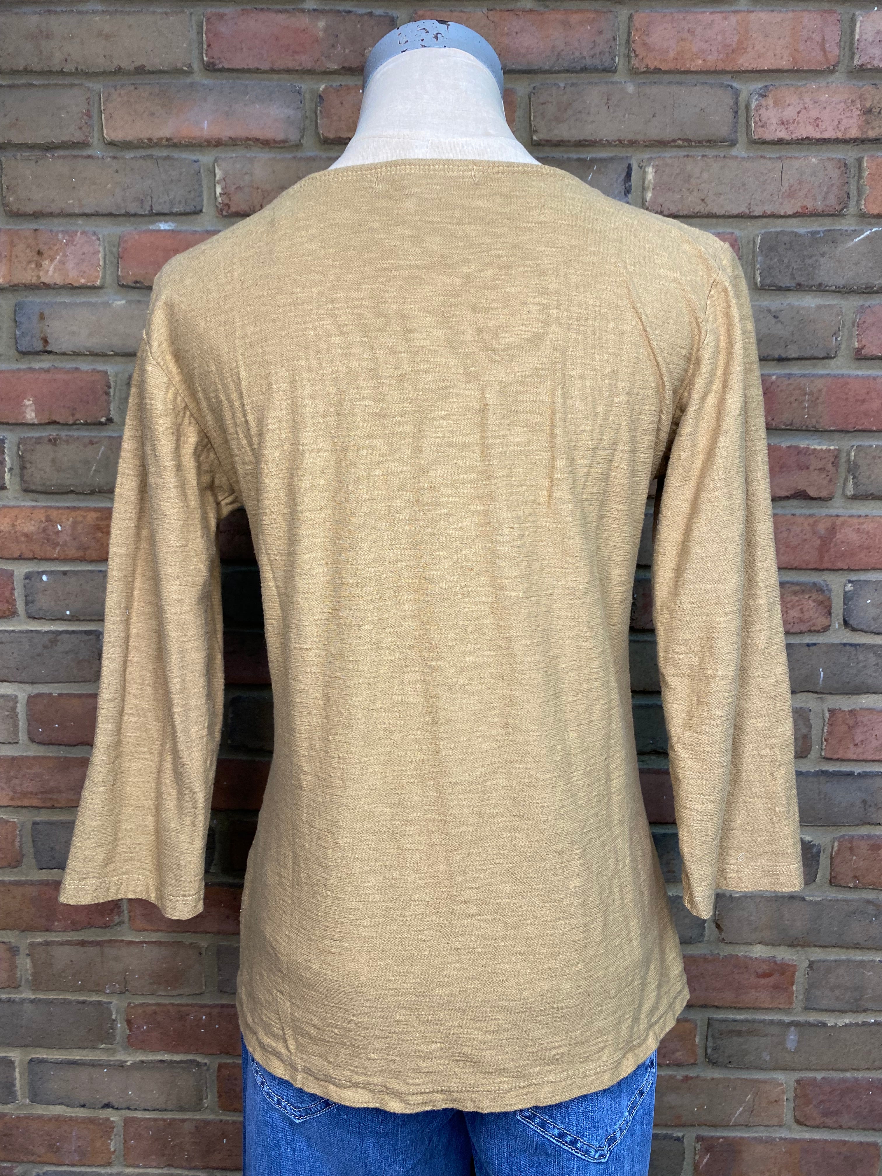 The three quarter sleeve slub knit top is so well made and so flattering. Fit is slightly small. This is a wonderful butterscotch gold color.