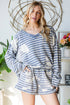 This blue and white striped long sleeve top and shorts set offers a relaxed, vintage-inspired look with its washed, faded finish and subtle bleach spots. The distressed details add character, while the shorts provide practical pockets for everyday convenience. Perfect for casual outings, this set combines comfort and style effortlessly.