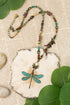 Hues of green and blues create warmth in this unique handmade collage necklace, finished with a patina dragonfly focal. The perfect addition to your designer jewelry collection.